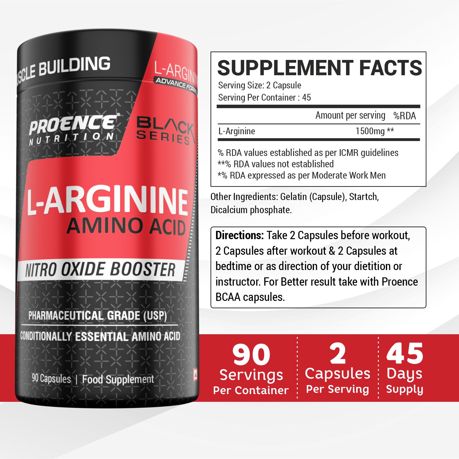 Proence Nutrition L-Arginine provides L-Arginine in capsule form for convenient daily use. Each serving delivers a total of 1500 mg of L-Arginine, packaged in a bottle containing 90 capsules.