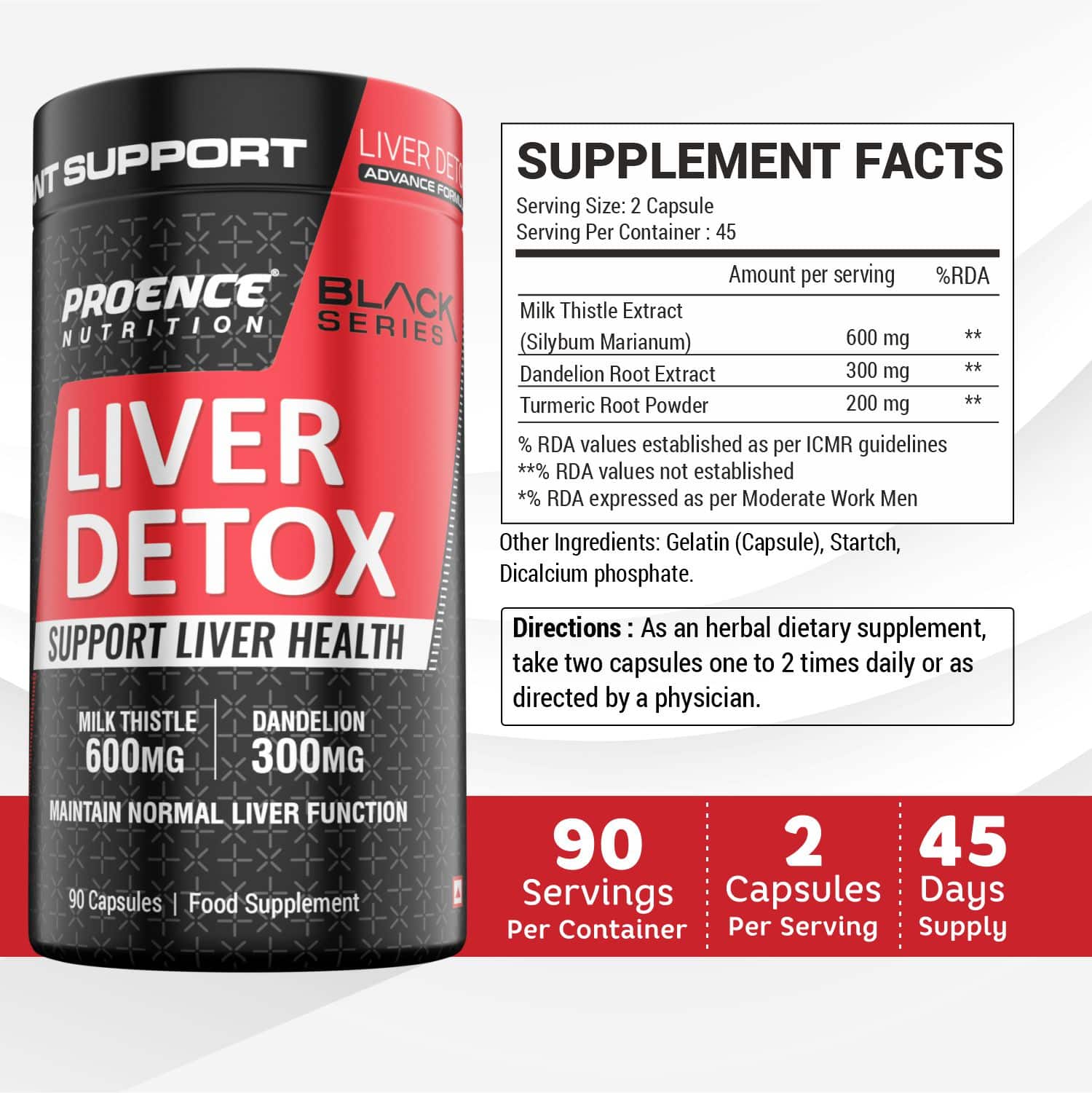 Proence Liver Detox is a dietary supplement provided in capsule form for convenient daily use. The product comes in a bottle containing 90 capsules and is formulated with a blend of ingredients commonly used in food supplements.