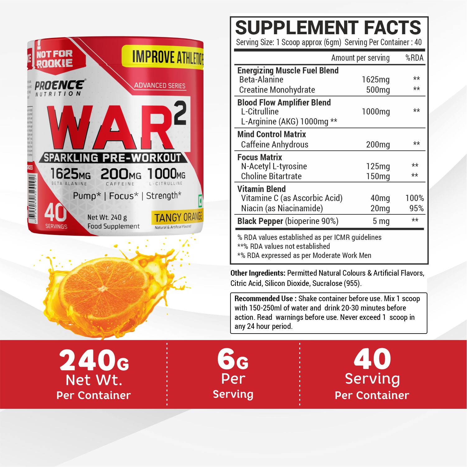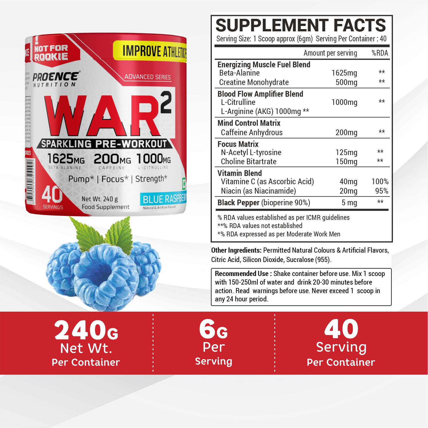 Proence WAR Pre-Workout is a dietary supplement provided in powdered form for convenient daily use. The formula contains a blend of nutritional ingredients and is designed to mix easily with water for simple and consistent intake.