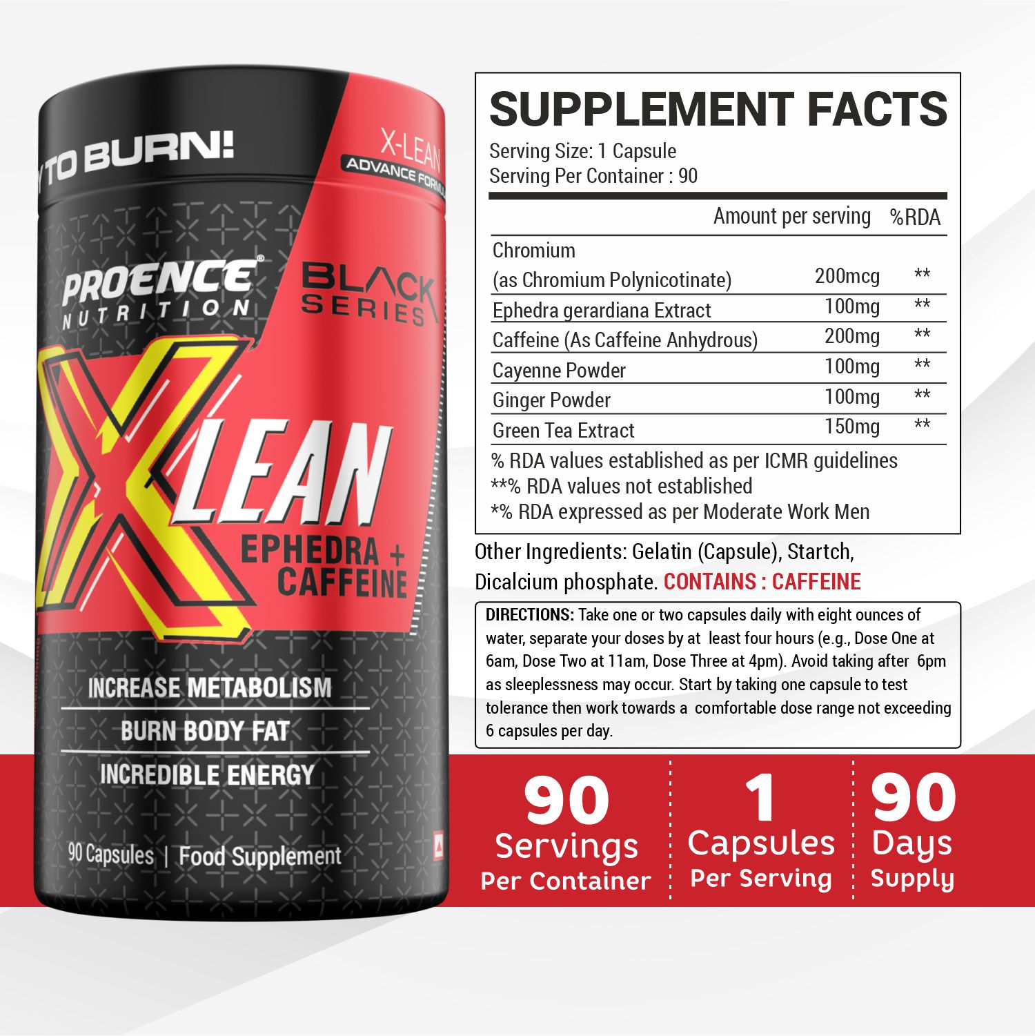 Proence X Lean Fatburner is a revolutionary blend of Chromium :-200 mcg , Green tea Extract:-150 mcg :- ,Gerardiana Extract:- 100 mg , Caffeine:- 200 mg ,Cayenne Powder:- 100 mg , Ginger Powder :-100 mg.